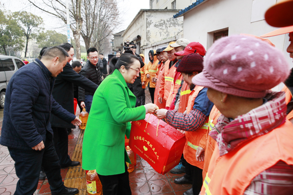 宋细妹代表浔阳区委、区政府和全区人民对“城市美容师们”表达了深深的敬意和诚挚的感谢,感谢环卫工人们长期以来弘扬“宁愿脏一人,换来万人洁” 的奉献精神,创造了整洁、舒适的城市环境。她还关切地询问大家的生活情况和身体状况,衷心祝愿大家阖家幸福、身体健康,快快乐乐的过一个新春佳节。